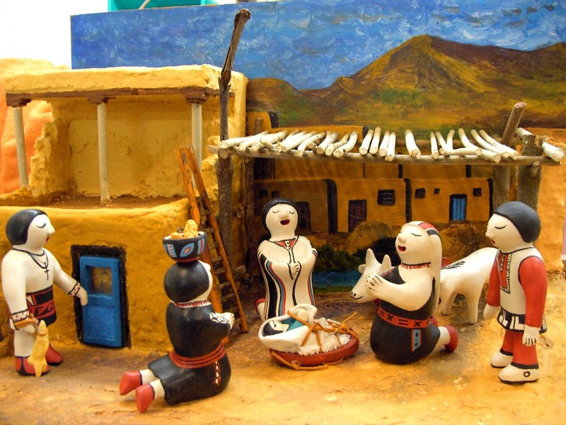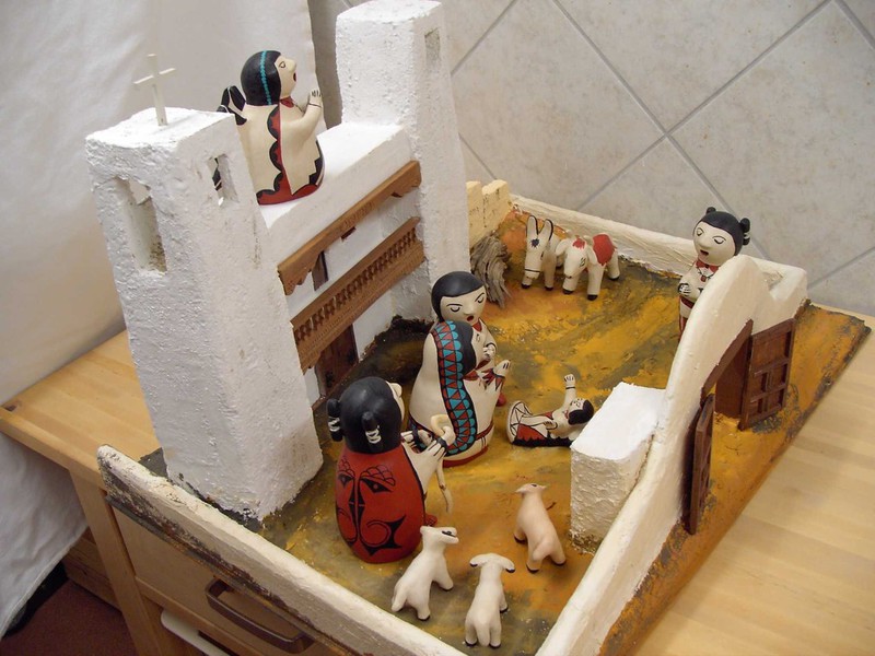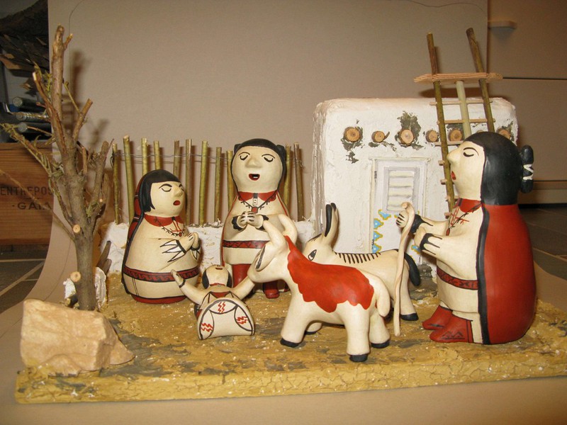 In der Zeit in der in Europa die freistehenden Krippenfiguren aufkamen, kamen die Indianern im Südwesten mit den ersten spanischen Eroberern in Berührung und damit auch mit den Symbolen und Kunstformen der Europäer. Zu dieser Zeit hatten die Pueblo- Indianer bereits ihre eigene Religion und Kunstformen, besonders die Töpferei. Die folgenden 300 Jahre europäischer Herrschaft brachten grundlegende Änderungen in der Lebensweise aller Indianer. Am Ende nahmen die meisten Pueblos das Christentum an, nicht um ihre eigene Religion zu ersetzen, sondern viel mehr als eine Erweiterung derselben. Unter der Leitung der Franziskanerpater bauten die Indianer die Pueblo-Missionskirchen, wobei sie die gleichen Materialien und Bauformen benützten, die sie jahrhundertelang für ihre eigenen Häuser verwendet hatten.